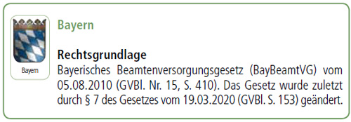Bayerisches Beamtenversorgungsgesetz (BayBeamtVG) vom 05.08.2010 (GVBl. Nr. 15, S. 410). Das Gesetz wurde zuletzt durch § 7 des Gesetzes vom 19.03.2020 (GVBl. S. 153) geändert.
